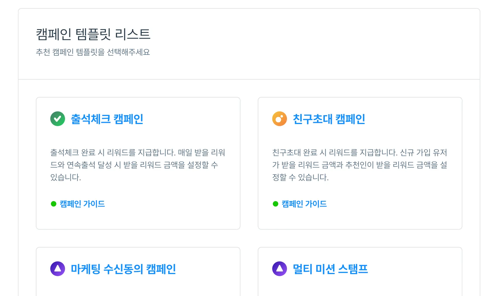 어드민 우측 상단의 탬플릿으로 새 캠페인 생성하기 버튼을 클릭하여 캠페인을 생성할 수 있습니다.