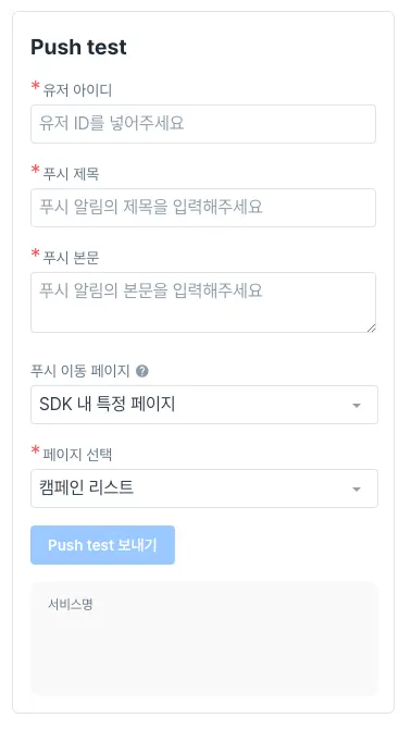 정보를 입력한 뒤 아래 Push Test를 통해서 정상적으로 동작하는지 확인할 수 있습니다.