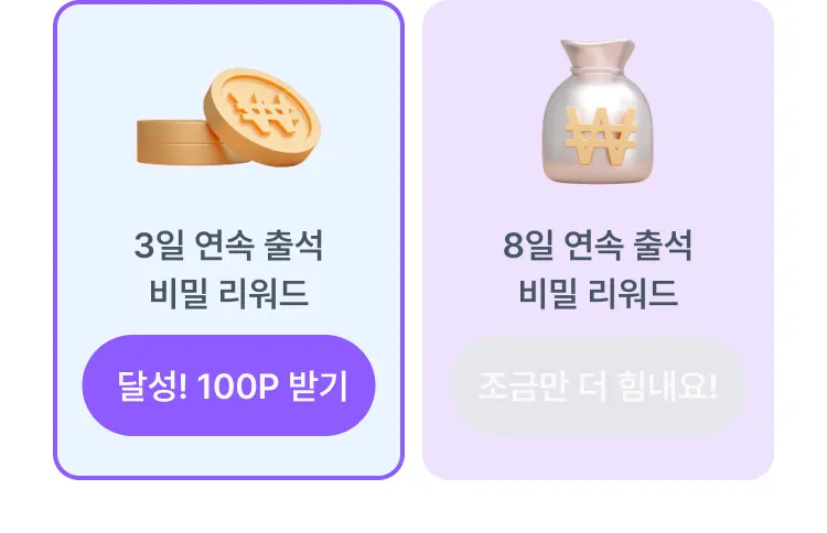 비밀 리워드 UI를 통해 연속 출석 시 지급하는 리워드를 강조할 수 있습니다.