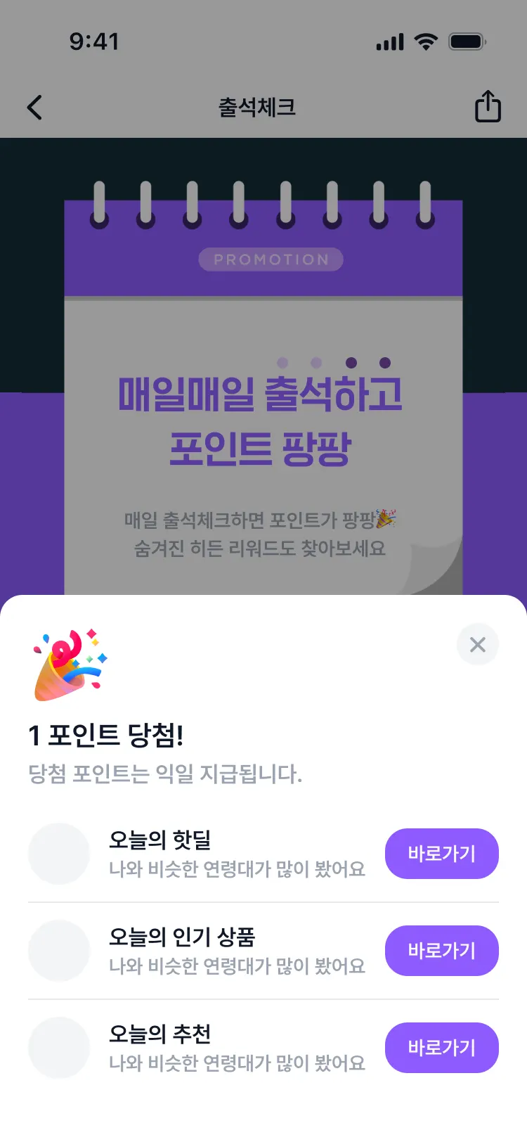 출석체크 참여 시 노출되는 바텀시트를 통해 유저를 다른 페이지로 이동시킬 수 있습니다.